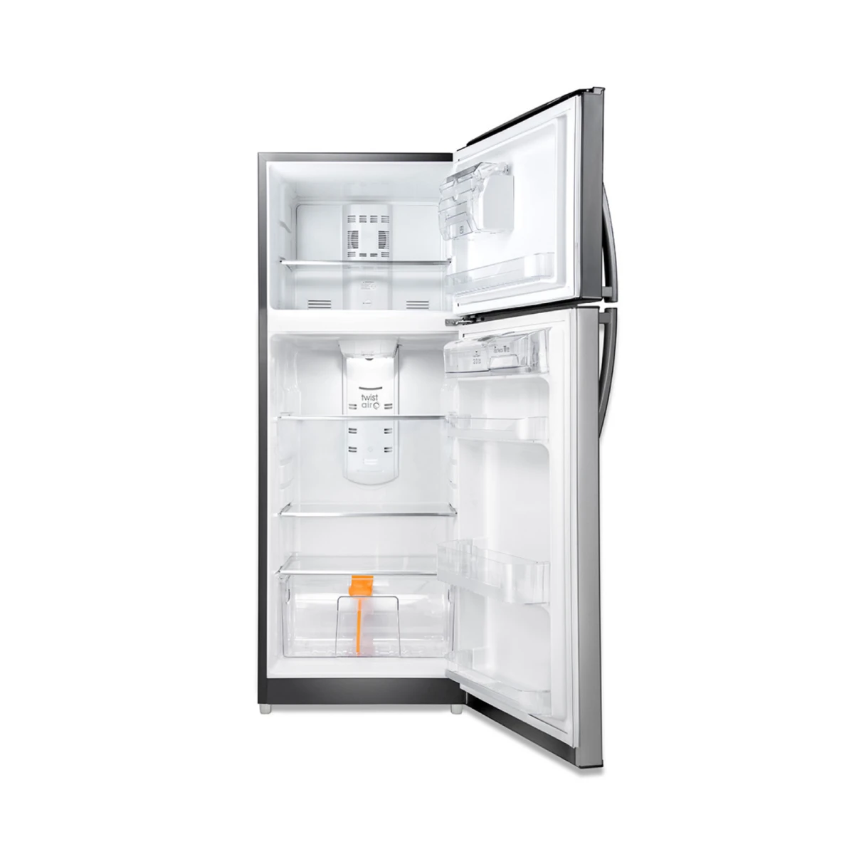Gracias a su sistema No-Frost con flujo de aire eficiente, evita la formación de escarcha y mantiene una temperatura uniforme en todos sus compartimientos, garantizando frescura prolongada. Interiormente cuenta con bandejas de cristal templado resistentes, anaqueles amplios para botellas y recipientes de gran tamaño, cajón legumbrero para frutas y verduras y espacio suficiente para recipientes voluminosos.
